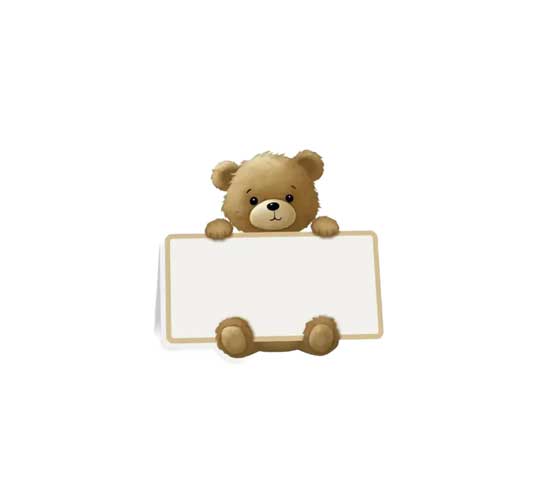 Hvite bordkort med utskåret bamse i farger. Perfekte bordkort til bursdag, dåp, eller navnefest!