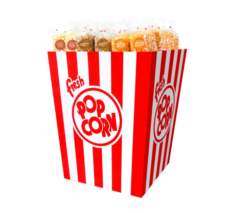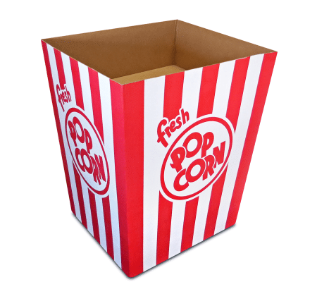 Salgsdisplay til popcorn i papp, for plassering på gulvet. En veldig fin måte å vise frem popcornet på som garantert blir lagt merke til. Passer godt til alle steder hvor det selges popcorn.