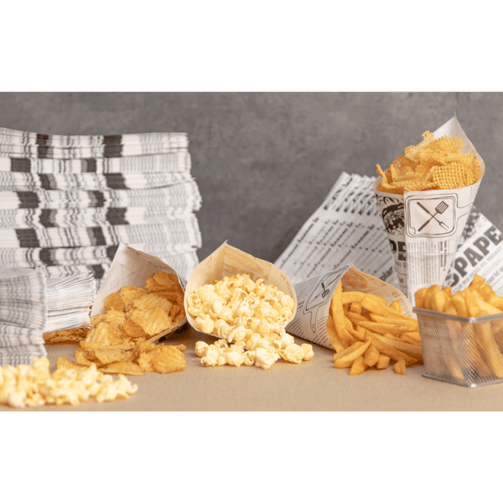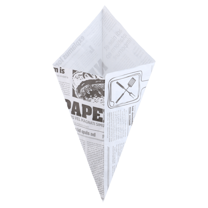 Papirstruter/ kremmerhus i avisdesign. Laget av kraft- og fettresistent glasspapir som sørger for at papirstruten forblir tørr på utsiden. Perfekt for fish & chips, Pommes frites, churros, popcorn osv..