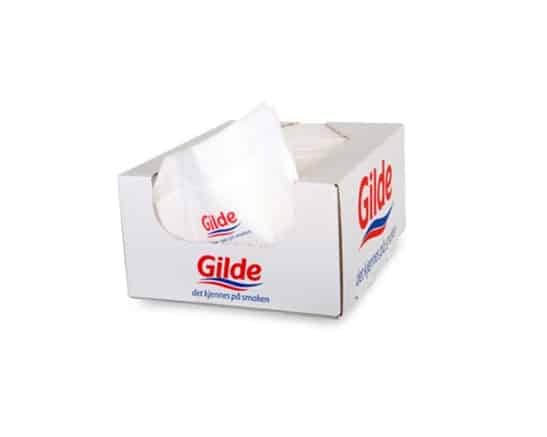 200stk servietter merket med “Gilde” i boks som fungerer som dispenser.